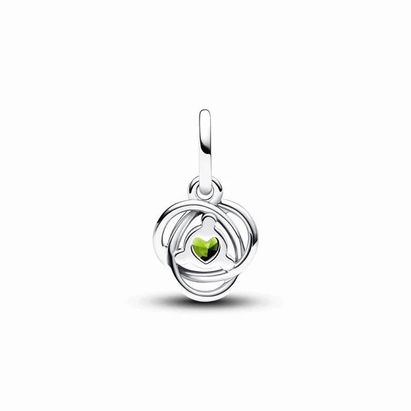 با اضافه کردن چارمهای آویز دایرهی ابدی نگیندار پاندورا به دستبندهای خود رنگ و شخصیتی جدید ببخشید.شما میتوانید با این چارم زیبا، تولدی در ماه آگوست ( ۱۰ مرداد تا ۹ شهریور ) را جشن بگیرید.این طرح خاص که چند دایره در هم تنیده را نشان میدهد، در مرکز خود دارای نگینی رنگی و درخشان است.این چارم نماد ابدیت و حسهای همیشگی است.هر یک از نگینها و رنگ آنها به عنوان نمادی برای ماه تولد اشخاص عمل میکنند.این نگین سبز روشن و بهاری، نماد ثروت و سعادت برای متولدین ماه آگوست است.شما میتوانید آن را به کلکسیون شخصی خود اضافه کنید یا به یکی از عزیزانتان که در ماه آگوست متولد شدهاست، هدیه دهید.