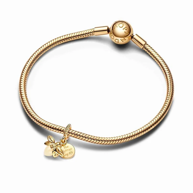 به معنی واقعی کلمه به استایل خود نور و درخشش اضافه کنید! چارم آویز کرم شبتاب پاندورا، طلایی بوده و با نگینی شبتاب ساخته شدهاست.این نگین در روز سفید و در شب به رنگ سبز فسفری روشن میدرخشد.این سنگ شبتاب با قرار گرفتن در معرض نور خورشید یا UV شارژ شده و در تاریکی شب از خود نور ساطع کرده و میدرخشد.در کنار کرم شبتاب شما دیسک طلایی کوچکی وجود دارد که روی آن پیام "تو زندگی من را نورانی میکنی" (You light up my life) حکاکی شدهاست.این چارم زیبا را به مجموعه چارمهایتان اضافه کرده یا به یکی از عزیزانتان هدیه دهید.