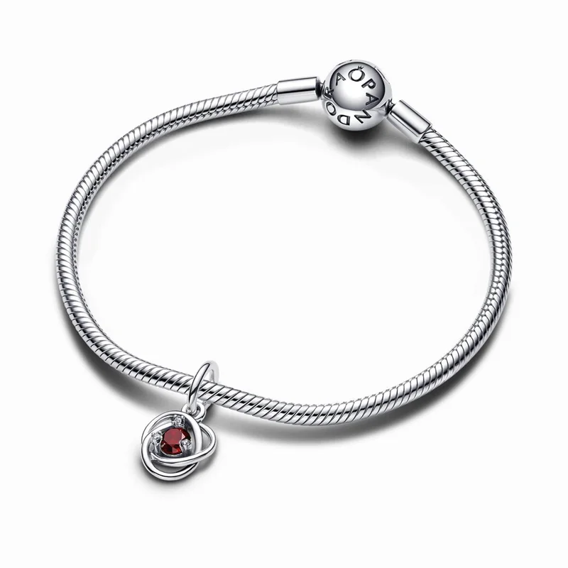 با اضافه کردن چارمهای آویز دایرهی ابدی نگیندار پاندورا به دستبندهای خود رنگ و شخصیتی جدید ببخشید.شما میتوانید با این چارم زیبا، تولدی در ماه ژانویه ( ۱۱ دی تا ۱۱ بهمن ) را جشن بگیرید.این طرح خاص که چند دایره در هم تنیده را نشان میدهد، در مرکز خود دارای نگینی رنگی و درخشان است.این چارم نماد ابدیت و حسهای همیشگی است.هر یک از نگینها و رنگ آنها به عنوان نمادی برای ماه تولد اشخاص عمل میکنند.این نگین قرمز تیره، نماد فداکاری،وفاداری و خوششانسی برای متولدین ماه ژانویه است.شما میتوانید آن را به کلکسیون شخصی خود اضافه کنید یا به یکی از عزیزانتان که متولد ماه ژانویه است، هدیه دهید.