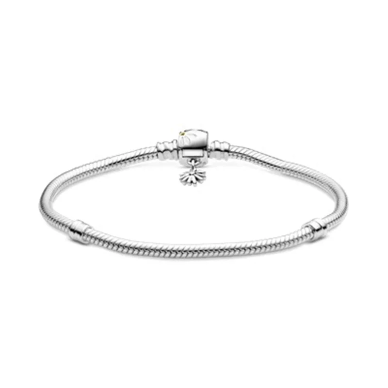 با دستبند زنجیر ماری گل مینا دقایق پاندورا، کمی گل به استایل خود اضافه کنید. از گل زیبا و در عین حال قدرتمند مینا که نماد آزادی است، الهام گرفته و استایل جدید خود را با اضافه کردن چارمهایتان به این کار بسازید.جزییات گل مینای سفید را در این کار به راحتی میتوانید ببینید، همچنین در مرکز گلها نگینهای زرد و شفاف زیرکُنیا وجود دارد که به درخشش دستبند شما میافزاید.به دستبند خود چارمهای گلی اضافه کرده و استایل گلدار خود را تکمیل کنید.