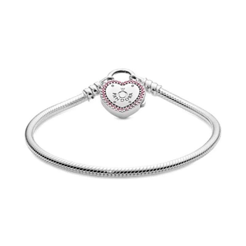 قفل درخشان این دستبند نقره ای با نگین های صورتی تزیین شده و شما می توانید آن را از دستبندتان جدا کرده و به زنجیری برای گردنبند خود اضافه کنید.این دستبند دقایق با قفلی متفاوت را می توانید مانند همه ی دستبندهای دقایق دیگر پاندورا با چارم های مورد علاقه خود تزیین کنید و استایلی عاشقانه بسازید.