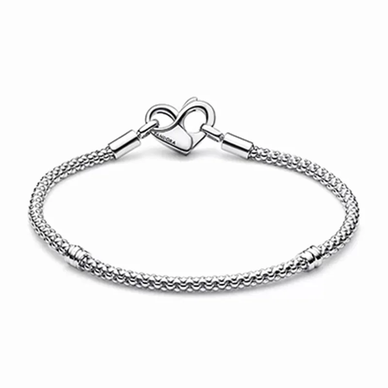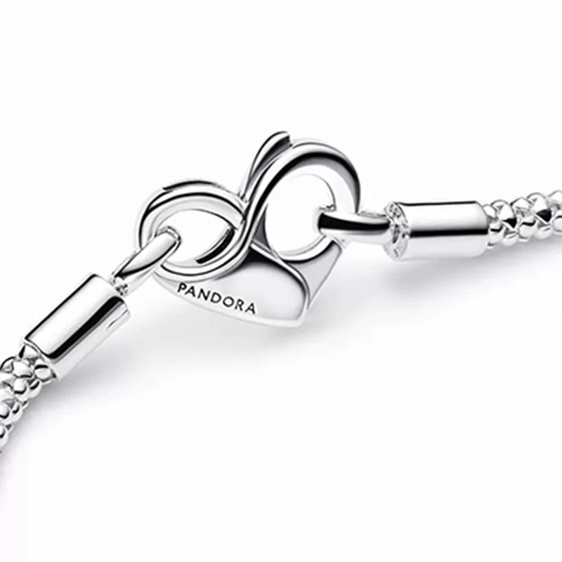 استایل پاندورایی خود را با این طرح جدید از دستبندهای دقایق ما به روز رسانی کنید. این دستبند نقره ای با زنجیری متراکم و گیره ای به شکل قلبی با علامت بی نهایت در داخل آن طراحی و ساخته شده است. شما می توانید 14 تا 18 چارم مورد علاقه خود را در سه بخش مختلف این دستبند چیده و استایل منحصر به فرد خود را بسازید.