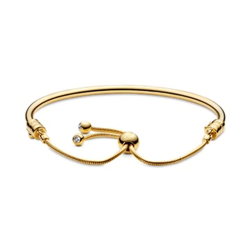 ترکیبی فوقالعاده از دستبندهای کشویی نرم و دستبندهای النگویی پاندورا.با حرکت دادن گیرهی کشویی اندازهی این دستبند دو بخشی را برای مچ دستتان تنظیم کنید.در انتهای هر بخش نگینهای شفاف زیرکُنیایی میدرخشند و به زیبایی این دستبند شیک میافزایند.این دستبند را به تنهایی در دست داشته یا آن را با دستبندهای پاندورایی دیگر ست کرده و استایل خاص خود را بسازید.