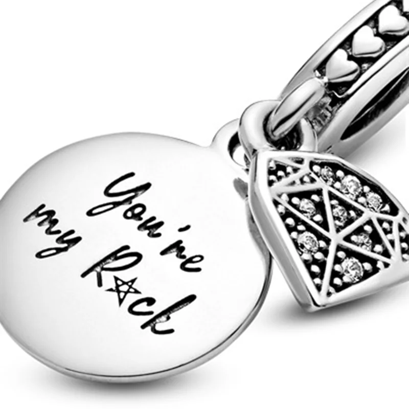 این چارم آویز زیبا را به شخصی وفادار که در شرایط سخت شما را تنها نمیگذارد هدیه دهید. این چارم دو بخشی با پیام "تو راک من هستی"(You're my rock) و نگین های شفاف زیرکنیا تزیین و برای اضافه شدن به دستبند دقایق شما یا شخصی خاص برای شما طراحی و ساخته شده است.