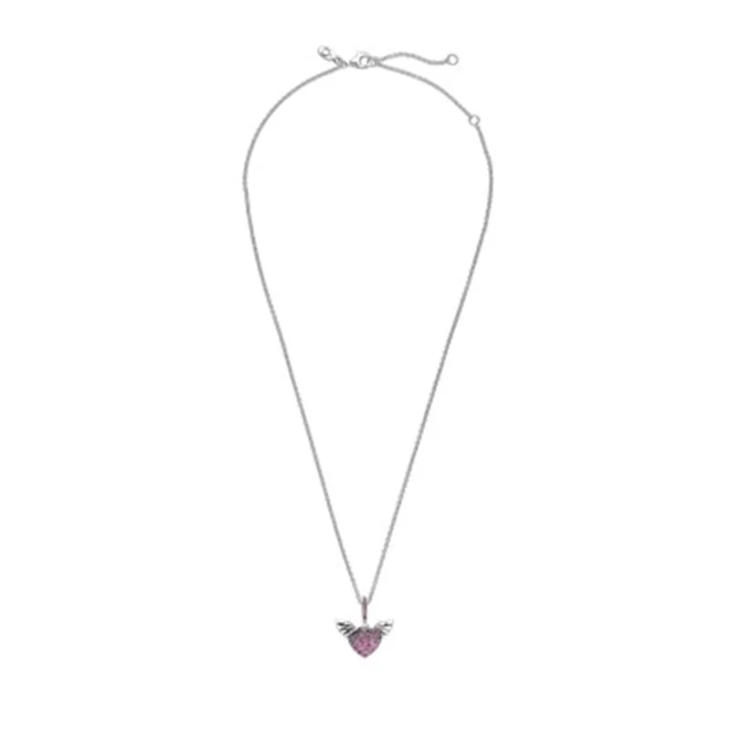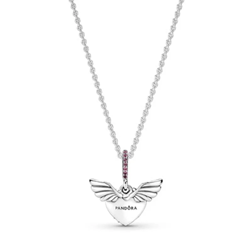 گردنبند قلب نگیندار و بالهای فرشته پاندورا از بهشت آمده است! این کار بهترین هدیه برای فرشته زندگیتان، یا اضافه شدن به کلکسیون شخصی شما میباشد.جنس این گردنبند نقره بوده و با نگینهای دستساز صورتی تزیین شده است.شما میتوانید به سه اندازه طول آن را تنظیم کنید.این گردنبند خاص با الهام از فرشتههای عشق و محافظ ساخته شدهاست.