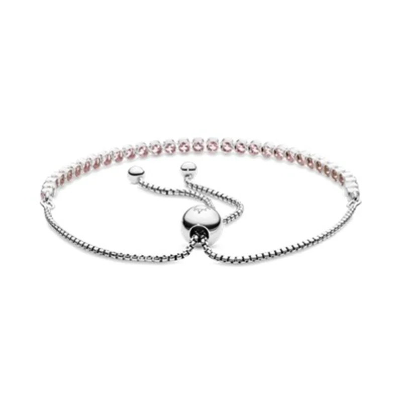 از اسم آن اشتباه برداشت نکنید این دستبند فقط برای بازیکنهای تنیس طراحی نشده است و روی مچ دست هر زنی میدرخشد! این دستبند نقرهای که با الهام از طرحهای قدیمی دستبندهای تنیسی پاندورا ساخته شده، با نگینهای صورتی زیرکُنیا تزیین و درخشندهتر شدهاست.همچنین کشویی یا لغزنده بودن گیرهی آن به شما این اجازه را میدهد که اندازه آن را به دلخواه تغییر دهید.