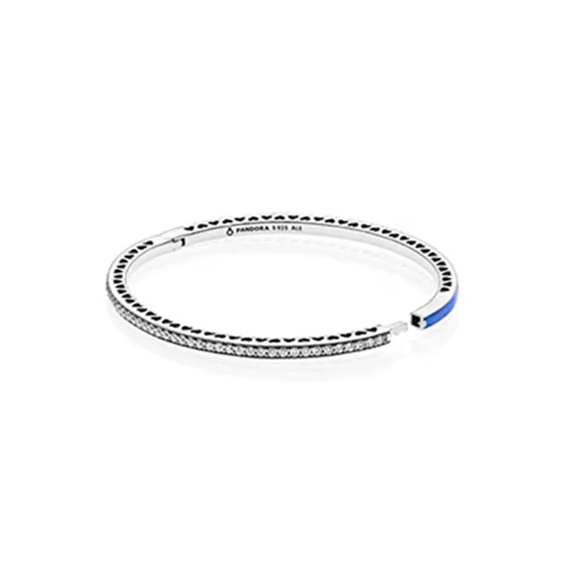 با دستبند النگویی قلبهای درخشان آبی تیره پاندورا عشقی رنگارنگ را به استایل خود بیاورید. این دستبند النگویی نقره ای به صورت دستی با نگین های شفاف تزیین و با لعاب رنگی لعاب کاری شده است. این طرح در رنگ های مختلف موجود بوده و شما می توانید آن را به تنهایی در دست داشته یا با سایر رنگ ها ست کرده و استایل شخصی خود را بسازید.