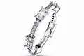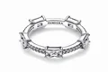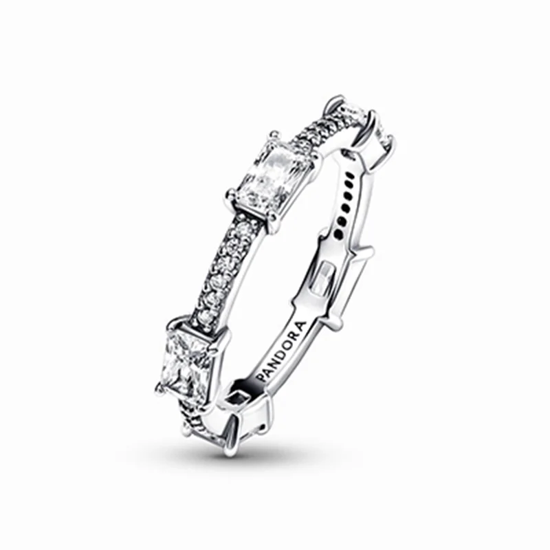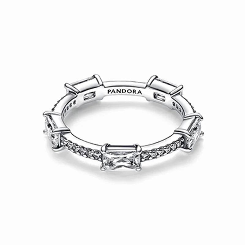 با ظرافت و شیک. طرحی که می تواند به هر ظاهری درخششی استثنایی اضافه کند. این حلقه نقره ای درخشان که با 5 نگین مستطیلی روی آن تزیین شده با الهام از دستبندهای تنیسی پاندورا طراحی و ساخته شده است. آن را به تنهایی در دست داشته یا با طرح های مشابه ست کرده و استایلی خاص برای خود بسازید.