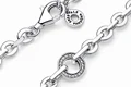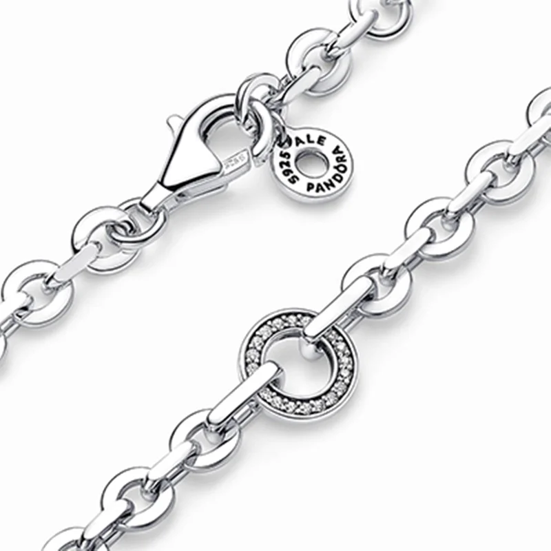 با زنجیرهای برجسته این دستبند استایل خود را برجسته و درخشان تر کنید. این دستبند نقره ای و زنجیری در مرکز خود دایره ای درخشان دارد که با نگین های شفاف تزیین شده است. آن را به مجموعه دستبندهای پاندورایی خود اضافه کرده یا به تنهایی در دست داشته باشید.