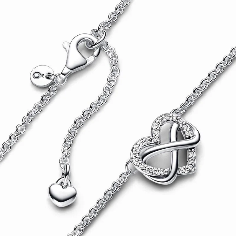 گیره این گردنبند به شکل یک قلب و نماد بینهایت یا ابدیت برش خورده و با نگینهای شفاف زیرکُنیا تزیین شدهاست تا نماد روابط و عشق های ابدی باشد.این گردنبند نقرهای و زیبا را به مجموعه خود اضافه کرده و هرجا که هستید به یاد عزیزانتان باشید.