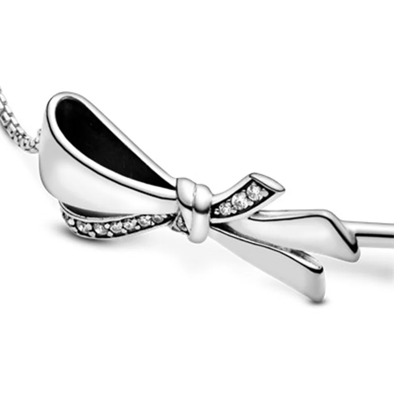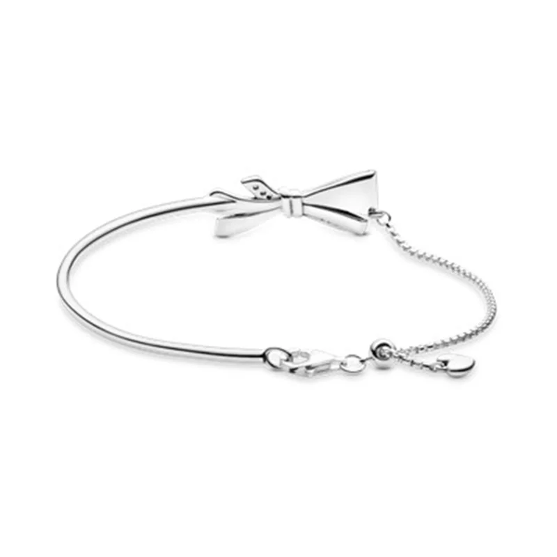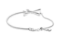ظاهری پر زرق و برق و دخترانه با این دستبند کشویی ظریف با پاپیونی بزرگ و درخشان بسازید.پاپیون نقره ای این دستبند زیبا با نگین های شفاف تزیین شده است.گیره کشویی آن به شما اجازه میدهد تا اندازه آن دور مچ دستتان را به راحتی کنترل کنید بدون آنکه از روی دست شما لغزیده و بیافتد.شما می توانید آن را به تنهایی در دست داشته یا با تعدادی دیگر از دستبندها ست کرده و استایلی چند لایه بسازید.