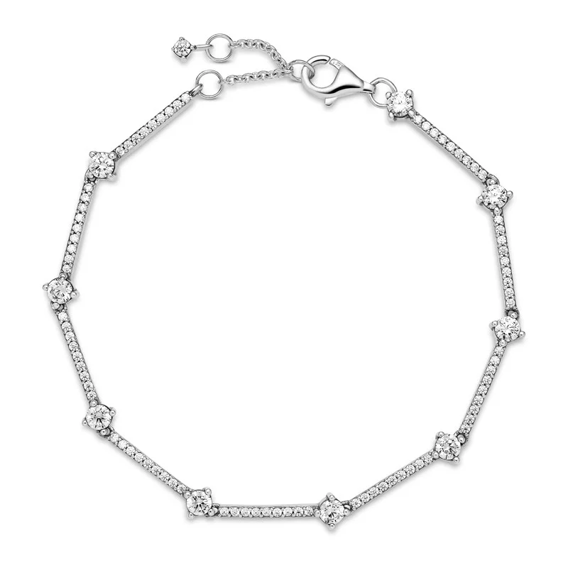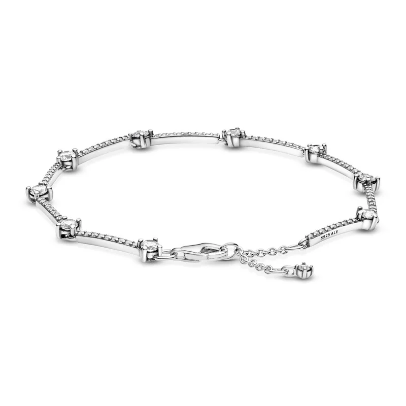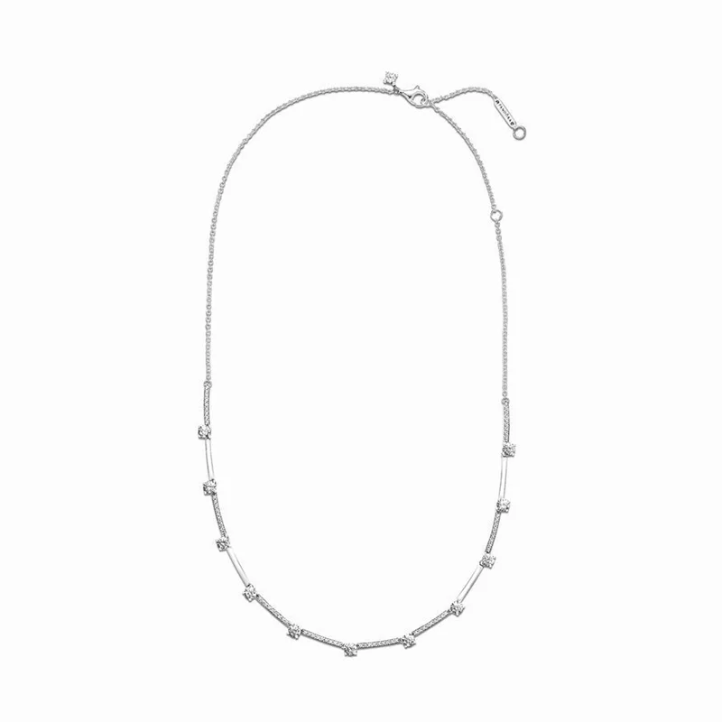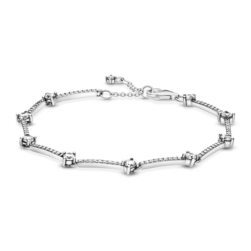 با ست درخشنده میلههای نگیندار نگین شفاف نقرهای پاندورا ظاهر خود را ارتقا دهید.این دستبند و گردنبند به صورت دستی طراحی شده، از جنس نقره بوده و دارای نگینهای شفاف و درخشان میباشند.طراحی این کارها با الهام از قطعات دیگر در آرشیو پاندورا بوده است.