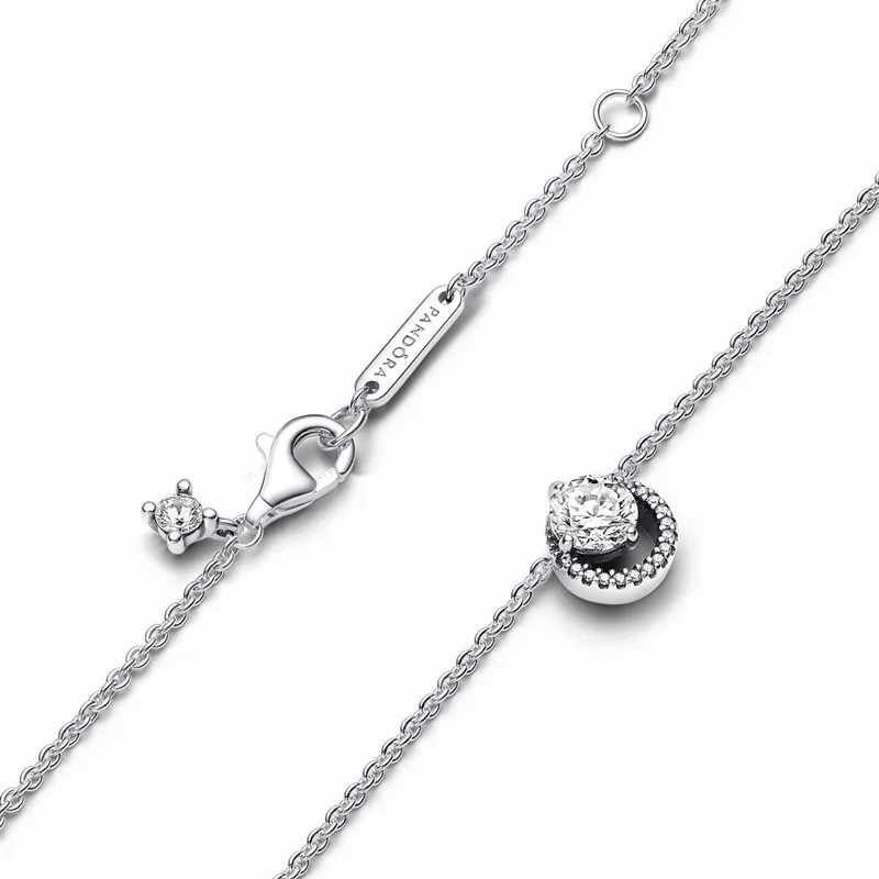 با این گردنبند، ظاهر روزانهی خود را زیباتر کنید. این گردنبند که از جنس نقره است، شامل یک آویز با یک نگین بزرگ و برجسته است که توسط ردیفی از نگینهای شفاف و درخشان احاطه شده است. نگین اصلی و بزرگ در مرکز قرار ندارد تا به طراحی عمق ببخشد. برای ست کردن این کار با دیگر طرحهای درخشان پاندورا بینهایت گزینه برای ترکیبی چشم نواز دارید.