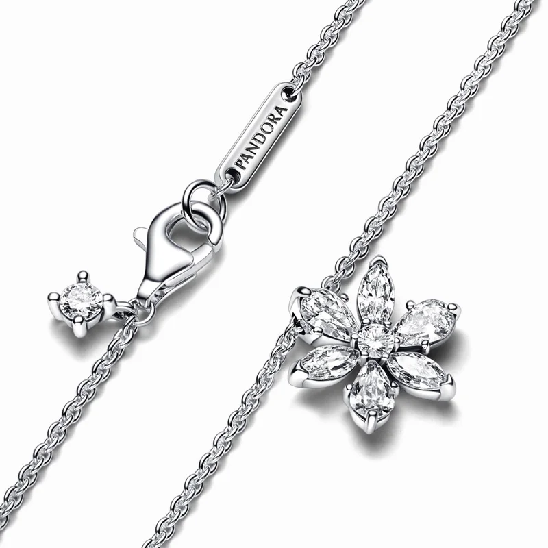 با گردنبند گل خوشهای پاندورا زیبایی طبیعت را به جواهرات و ظاهر خود بیاورید.این گردنبند با نگینهای شفاف زیرکنیا تزیین و درخشان شدهاند. نگینهای گرد و گلابی شکل درخشش و جلوههایی متفاوت را روی این قطعه به نمایش میگذارند. این قطعه با الهام از تفسیر چگونگی شکلگیری گلها و برگها در طبیعت طراحی و ساخته شده است.